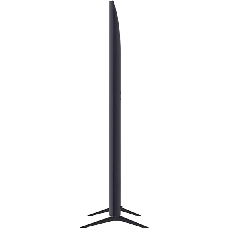 تلویزیون 75 اینچ ال جی NANO77 از زبان طراحی 3 Sided Cinema Screen برخوردار است و طراحی نسبتا شیک دارد. به لطف این زبان طراحی، حاشیه چپ، راست و بالای تلویزیون باریک تر است که باعث می شود روی محتوای در حال پخش تمرکز بیشتری داشته باشید. ضخامت این تلویزیون در حدود 59.9 میلیمتر می باشد و برای نصب روی دیوار مناسب است. البته باید گفت پایه دیواری مناسب را باید به صورت جداگانه خریداری نمایید و به همراه این محصول عرضه نمی شود. به همراه این محصول تنها پایه رومیزی ارائه می شود که از نظر طراحی با کوچکترین سایز این مدل متفاوت است. پایه این تلویزیون از نوع دو شاخه است که توسط پیچ هایی در دو طرف تلویزیون نصب می شود. به همراه این تلویزیون گیره های مخصوص و بستی ارائه می شود که برای مدیریت کابل مورد استفاده قرار می گیرند. از جمله تفاوت های محصول پیش روی شما با سایز های کوچکتر خود، کابل برق است که به بدن محصول متصل بوده و قابل جدا شدن نیست. این تلویزیون دارای پورت های مختلفی نظیر درگاه شبکه (RJ-45)، HDMI، 2 عدد USB و… است که در پشت تلویزیون قرار دارند. برخی از این پورت ها به گونه ای طراحی شده اند که از کنار تلویزیون می توان به آنها دسترسی داشت. به این ترتیب زمانی که تلویزیون فوق روی دیوار نصب شده باشد، این پورت ها راحت تر در دسترس می باشند.